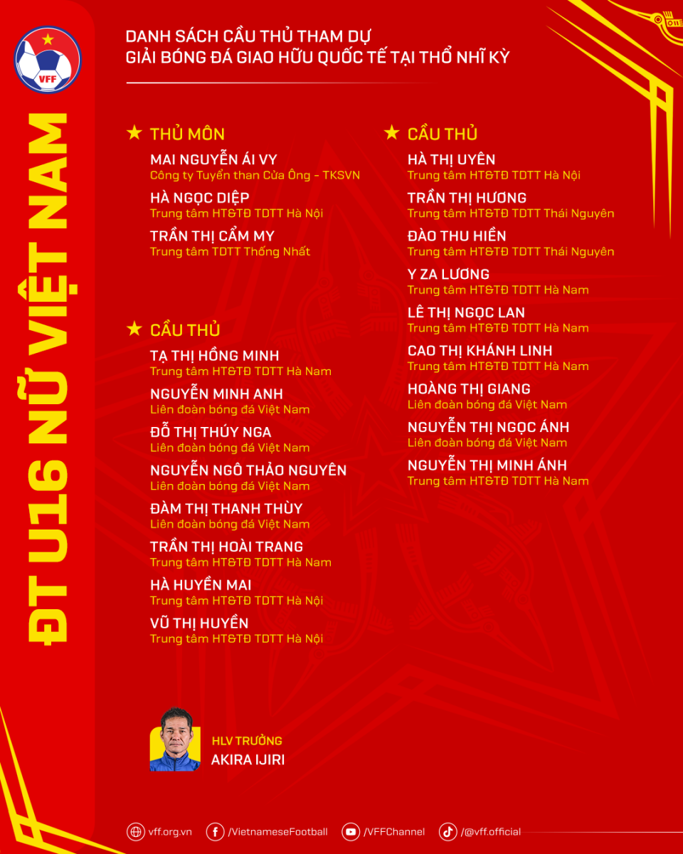 Danh sách ĐT U16 nữ Việt Nam tham dự giải bóng đá giao hữu quốc thế tại Thổ Nhĩ Kỳ: