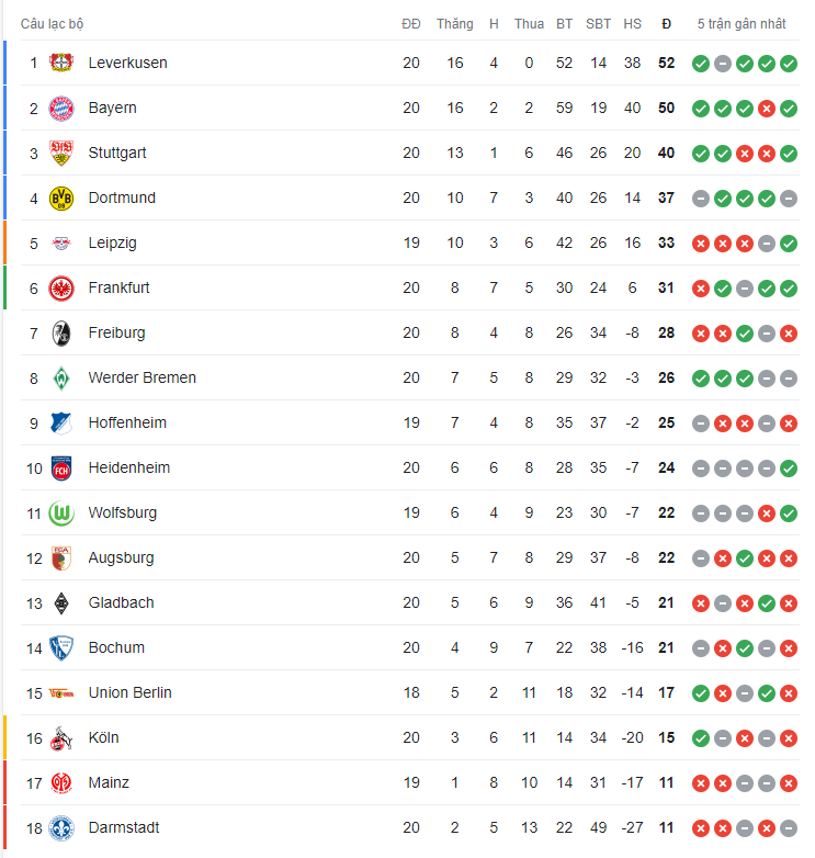BẢNG XẾP HẠNG BUNDESLIGA 2023/24