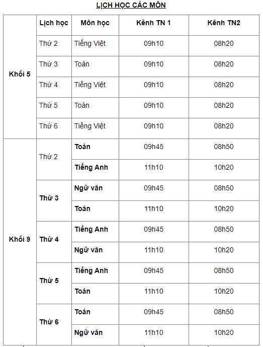 *Đối với lớp 9: Các môn Toán, Ngữ văn, Tiếng Anh được phát sóng lúc 9h15 từ thứ hai đến thứ 7 (Mỗi tiết học 45-50 phút)
