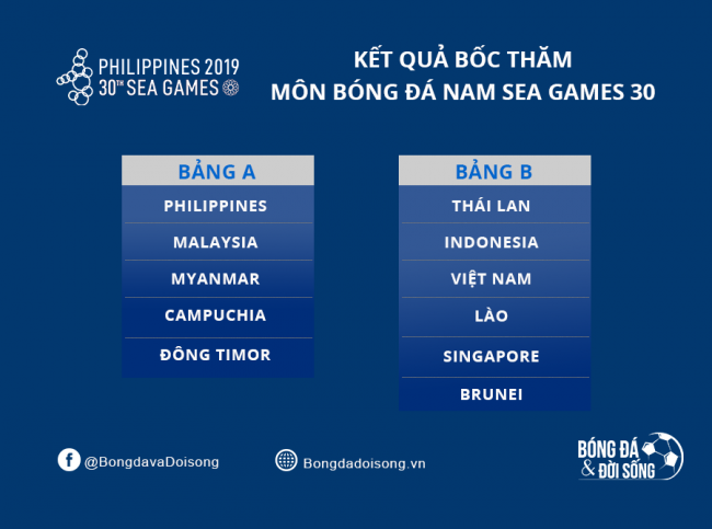 Lễ bốc thăm chia bảng các môn đồng đội SEA Games 30 đang được tiến hành tại Philippines. Kết quả vừa cập nhật từ nội dung bóng đá nam SEA Games 30 cho thấy, U22 Việt Nam nằm ở bảng B, bảng đấu có 6 đội tham gia gồm U22 Thái Lan, U22 Indonesia, Lào, Singapore và Bruinei! Trong đó bảng A là sự góp mặt của chủ nhà Phillipines, Malaysia, Myanmar, Campuchia và Timor - Leste.